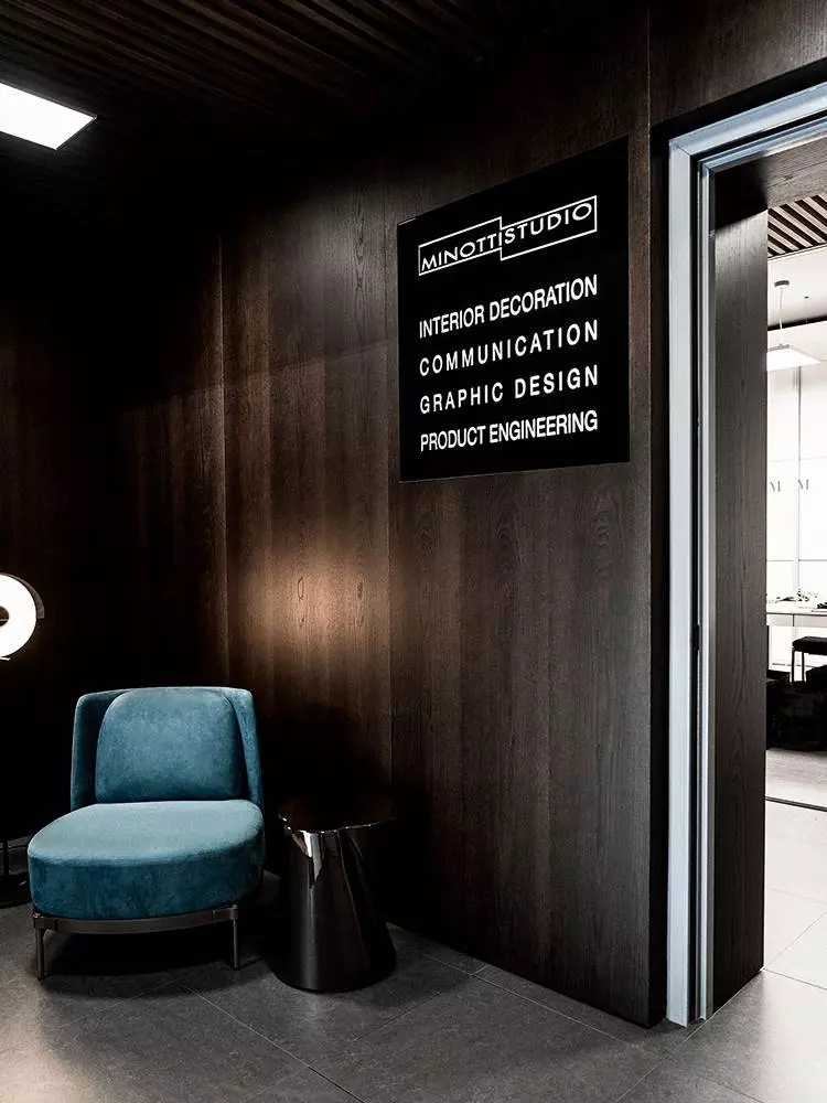 Die verschiedenen Bereiche, die im Minotti-Stil gestaltet wurden, weisen zahlreiche Anspielungen auf die ästhetische Sprache der Marke auf, angefangen von der Holzlattenverkleidung der Decke der Hauptstruktur bis hin zur Farbe, die für den Bodenbelag gewählt wurde: die Nuance „Minotti-grau“, die charakteristisch für das Unternehmen ist. All diese dekorativen Elemente verbinden Minotti Studio wie ein Bindestrich mit den anderen Showrooms und „Schaufenster“ in der Welt.