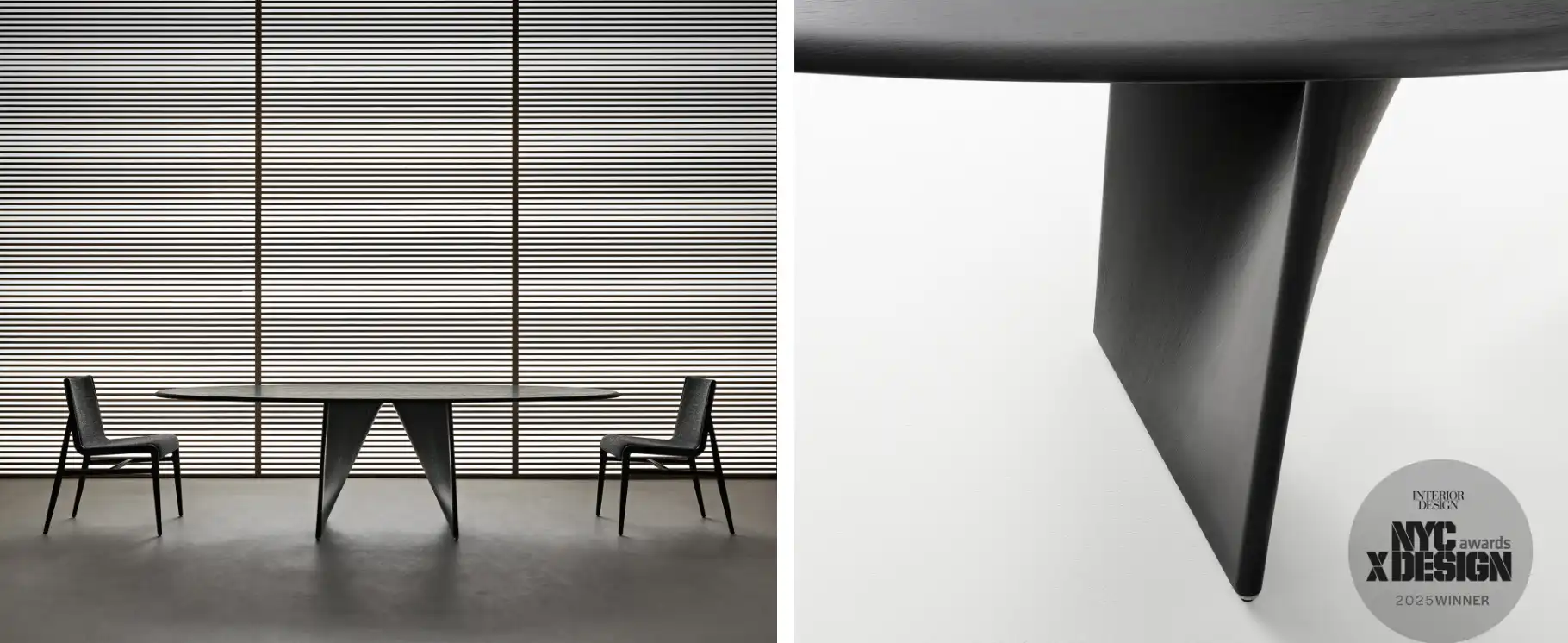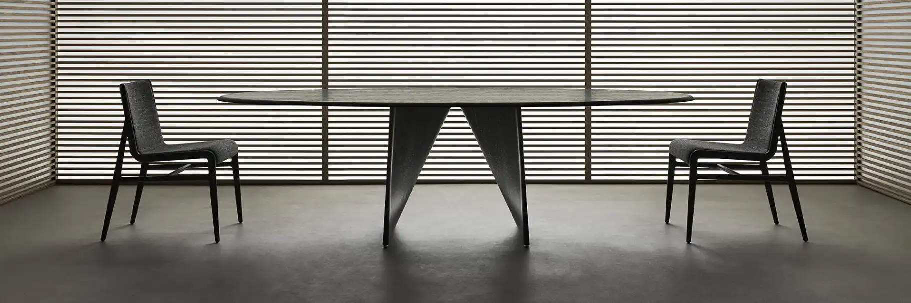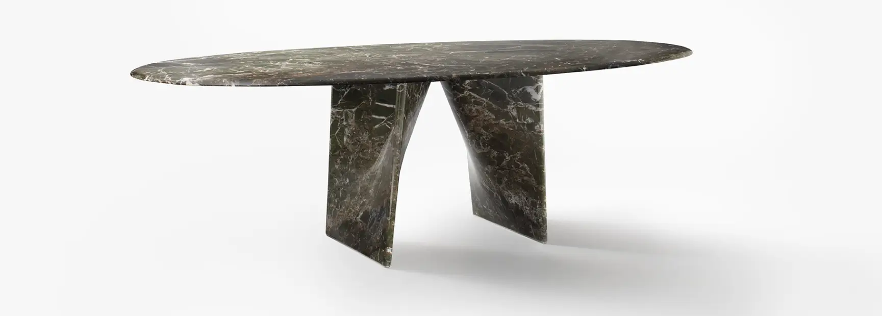 Fließende, elegante Linien zeichnen den Lambda-Tisch aus, der mit seiner skulpturalen Ausstrahlung eine perfekte Balance zwischen visueller Leichtigkeit und formaler Originalität bietet. Das Herzstück des Designs bildet der Sockel, der aus zwei Elementen besteht, die an sich gegenüberstehende Blätter erinnern. Diese biegen sich, beginnend mit einer geradlinigen Form, nach oben, je näher sie der Mitte kommen. Das ästhetische Ergebnis, das an den griechischen Buchstaben Lambda angelehnt ist, überzeugt sowohl durch seine feine Eleganz als auch durch eine beeindruckende strukturelle Solidität. Besonders zur Geltung kommt dieses Design in seiner einheitlichen Materialausführung: Die Maserung des Marmors, die natürliche Struktur des Holzes und die durch die exklusive Terrae-Technik von Rimadesio entstehenden, weichen Oberflächen verleihen dem Tisch eine außergewöhnliche Ausstrahlung.