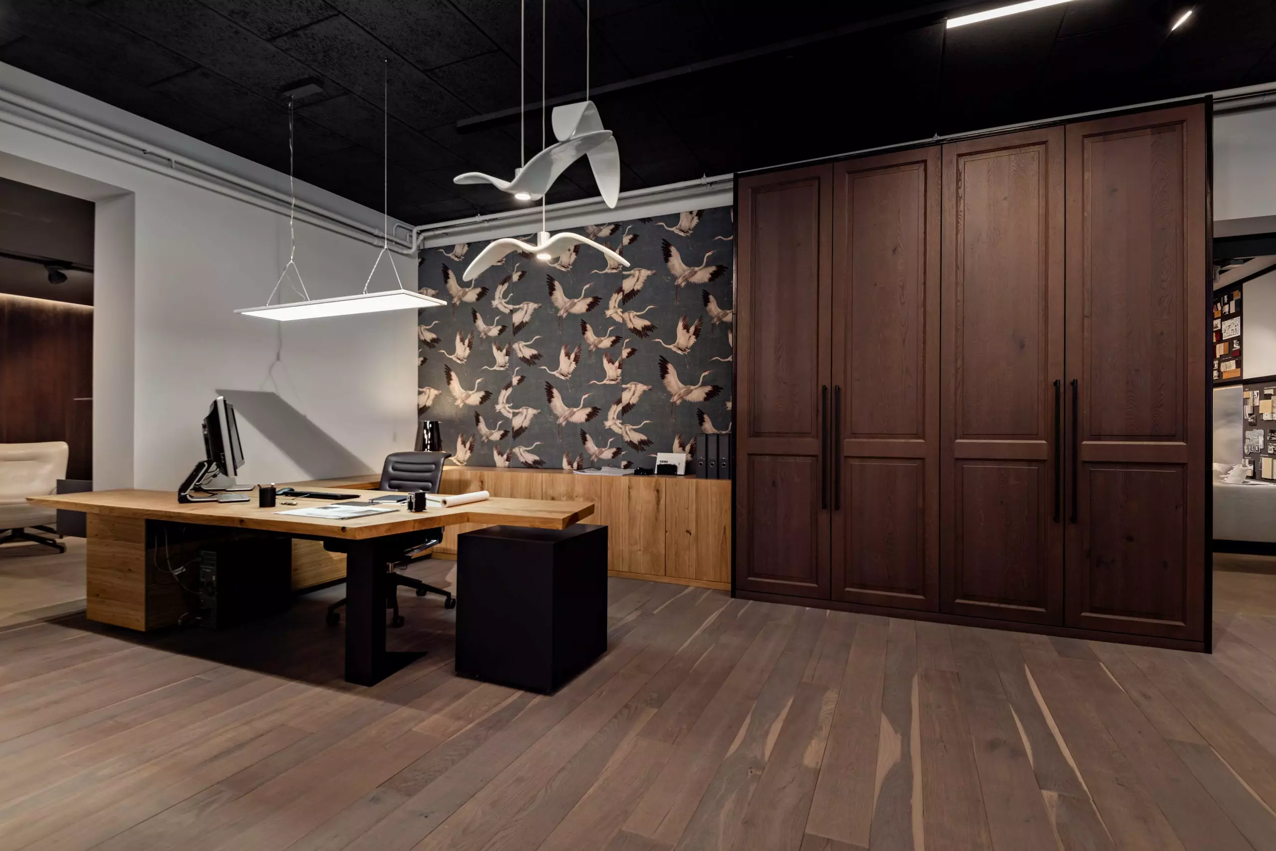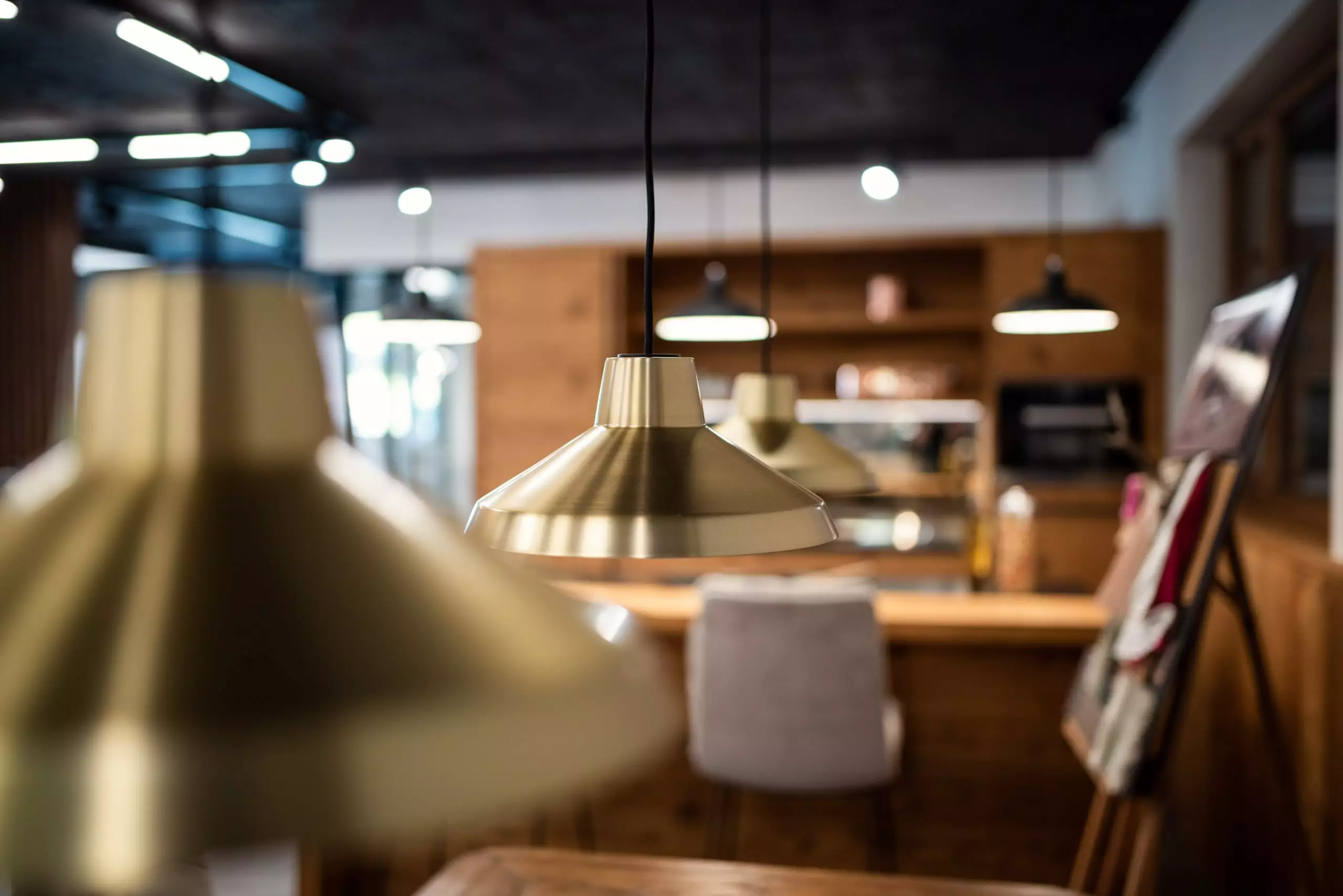 Minotti Mils Stühle und eine Brokis Shadows Pendelleuchten aus Holz und Glas.