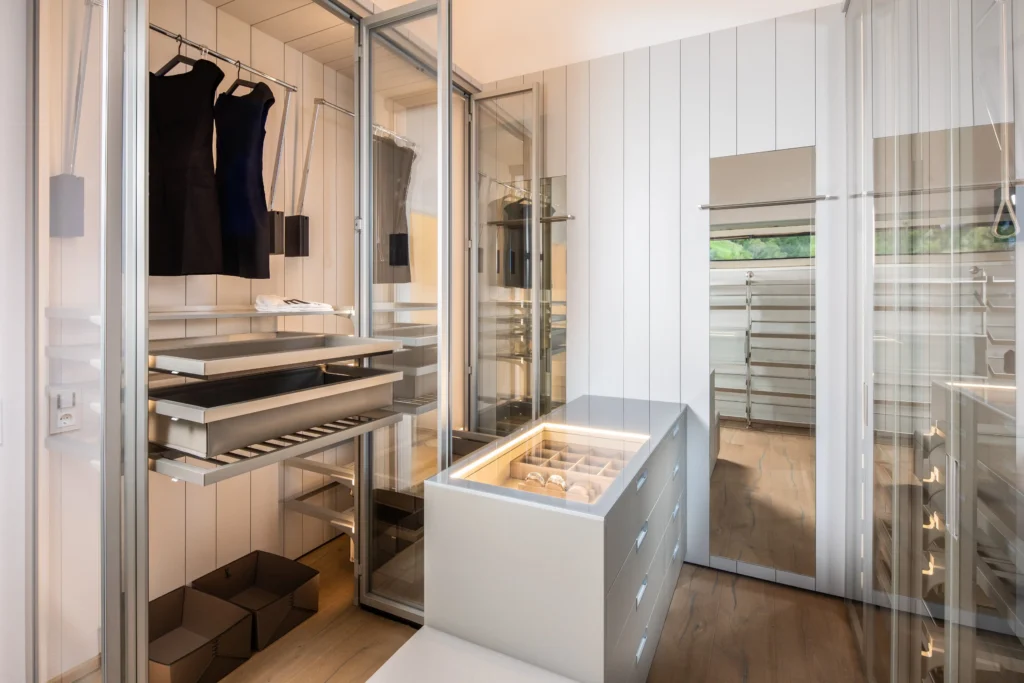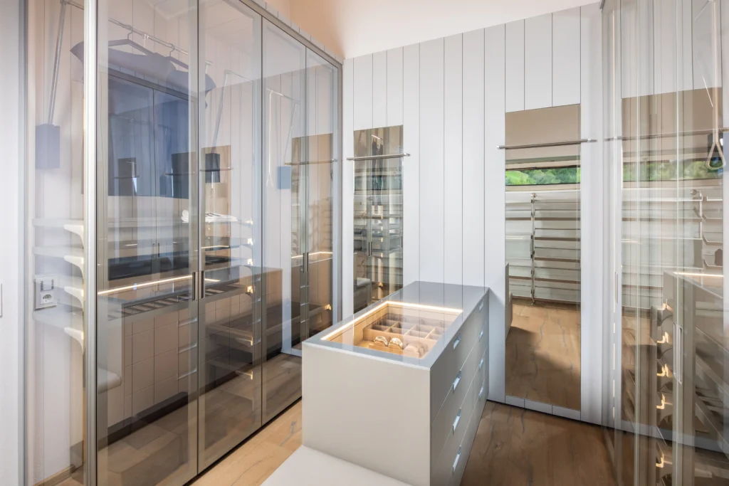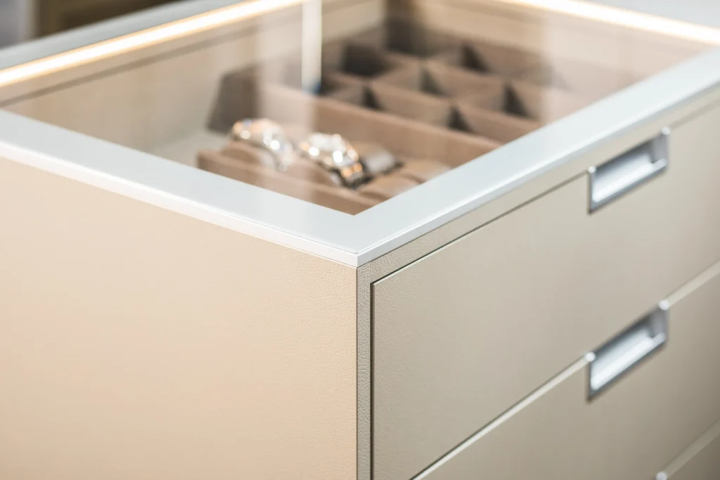 Maßangefertigte Wandvertäfelung mit flächenbündigen Spiegel und eingearbeiteten Mittelelement mit beidseitig bedienbarer Schmucklade in voll Lackierung und Leder Interior aus der hauseigenen Tischlerei Reiter