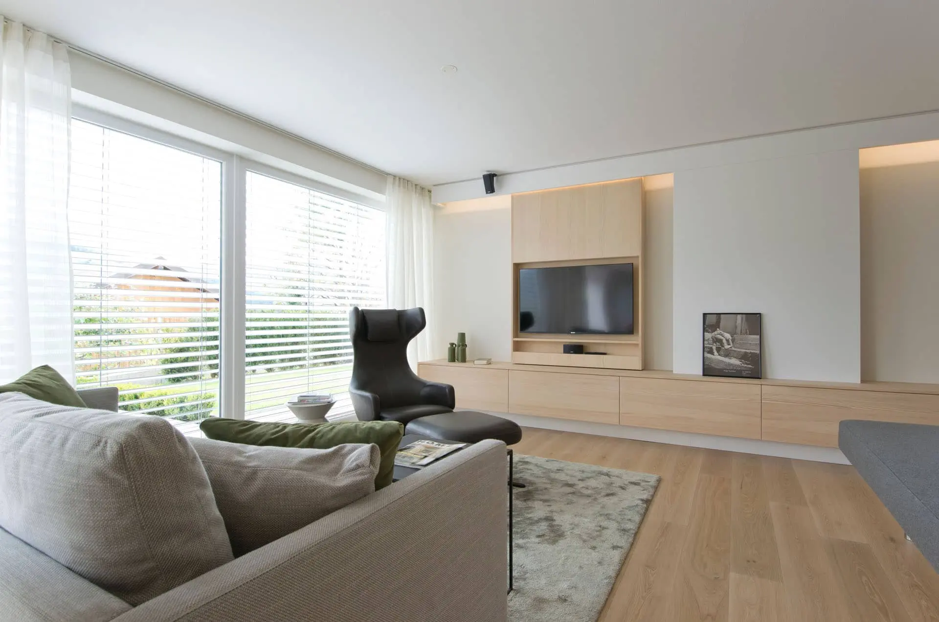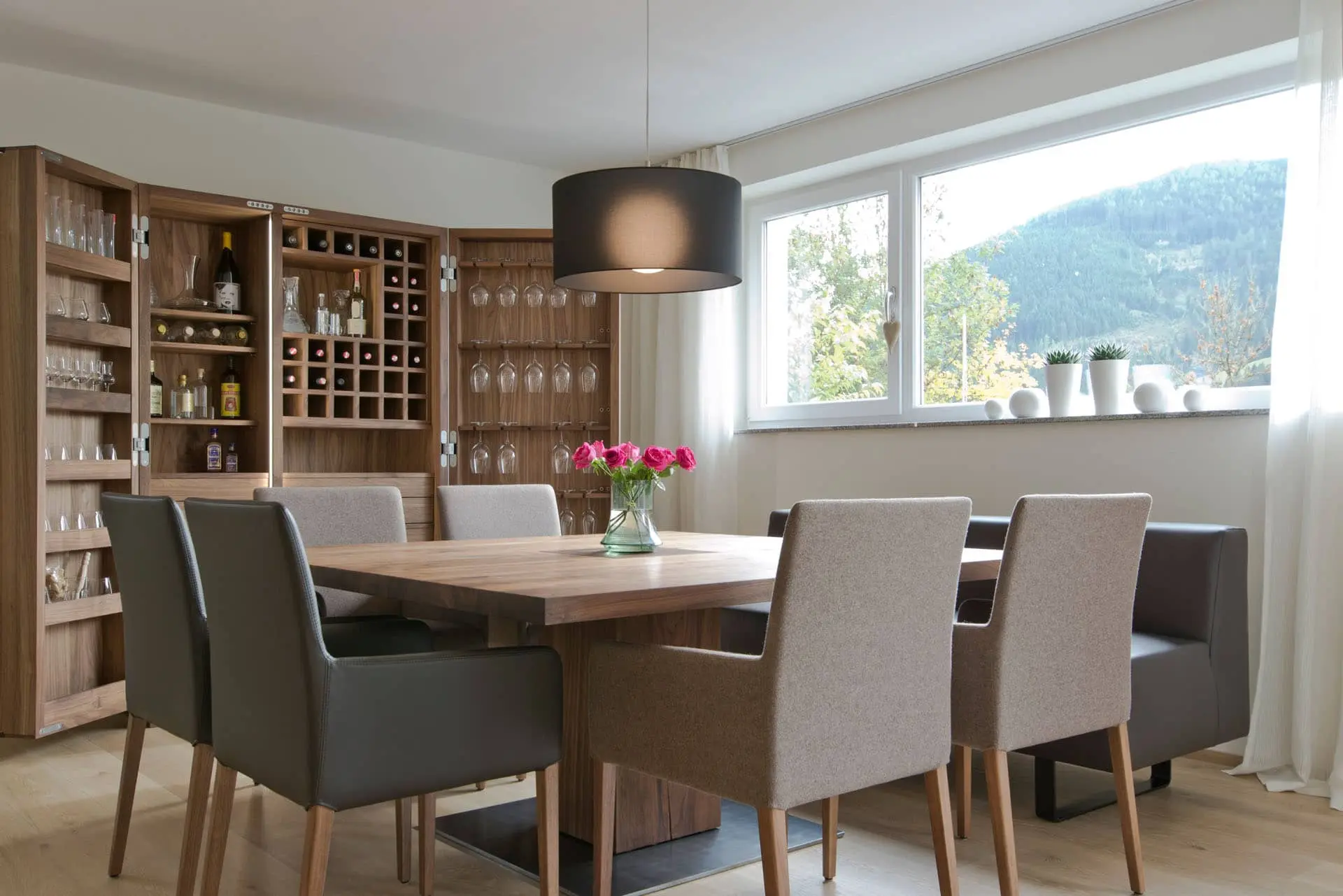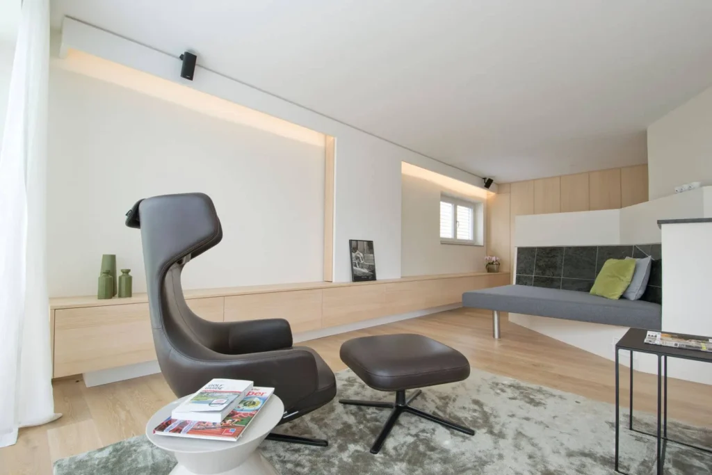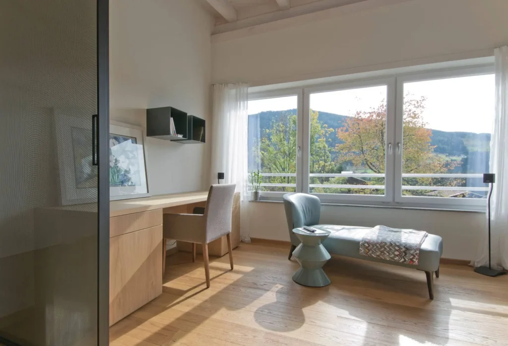Eine perfekte Kombination aus Naturholz, edlen Textilien und Leder verbindet unser Projekt in Eben