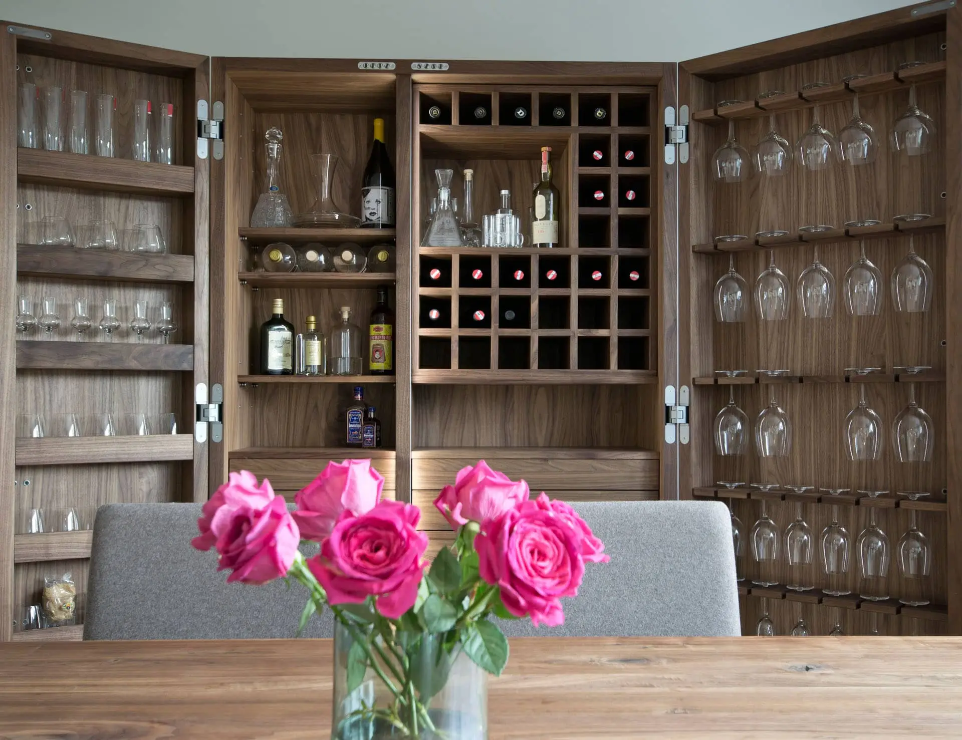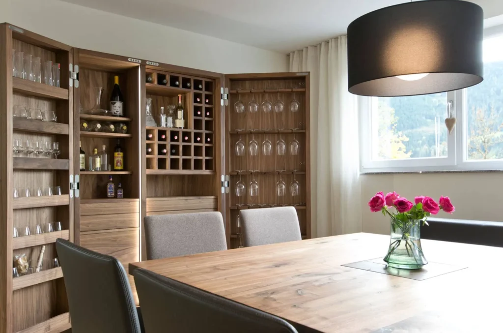 Das Zusammenspiel von weiß geölter Tanne, Lodenstoff und massiver Nuss gibt den Raum Charakter und eine gemütliche Atmosphäre