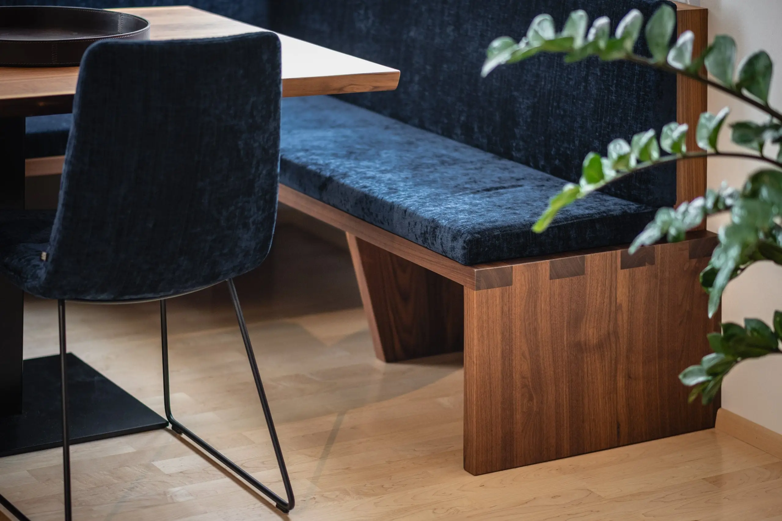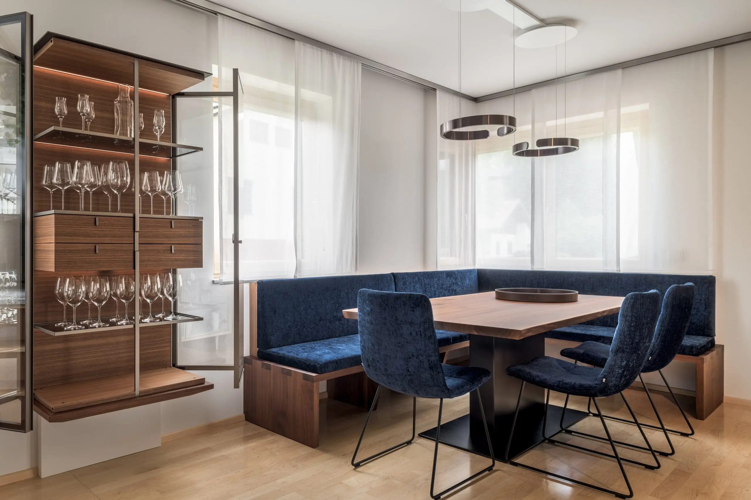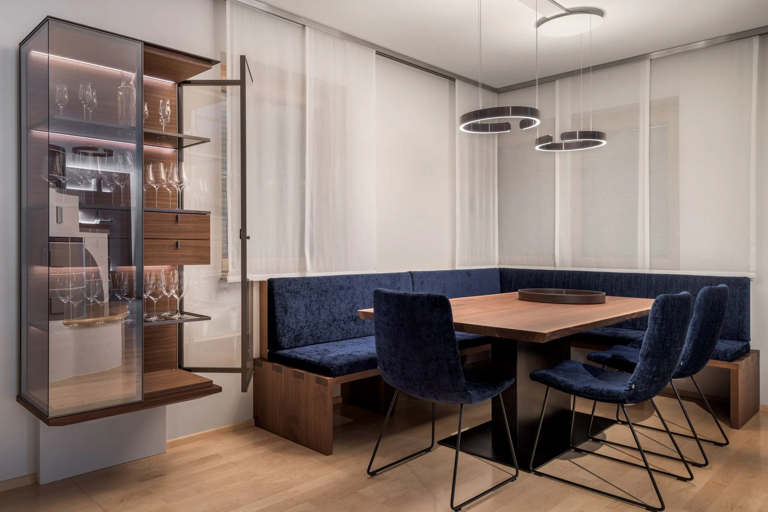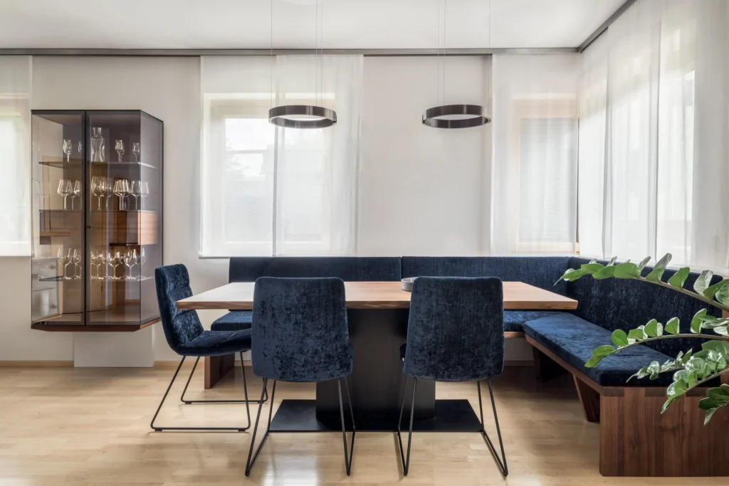 M-Studio Reiter Innenarchitektur Innenraumplanung Interior Design Konzept mit Rimadesio und Tischlerei M-Studio Reiter Tischlerei und Möbelstudio Eckbank und Tisch aus der hauseigenen Tischlerei Wandgestaltung mit Sideboard und Hängeelemente mit Rimadesio