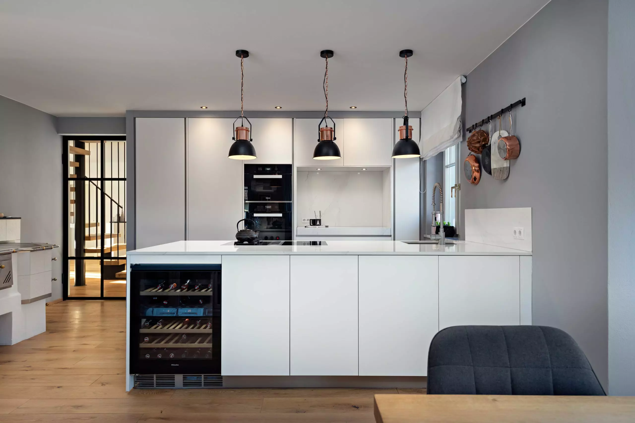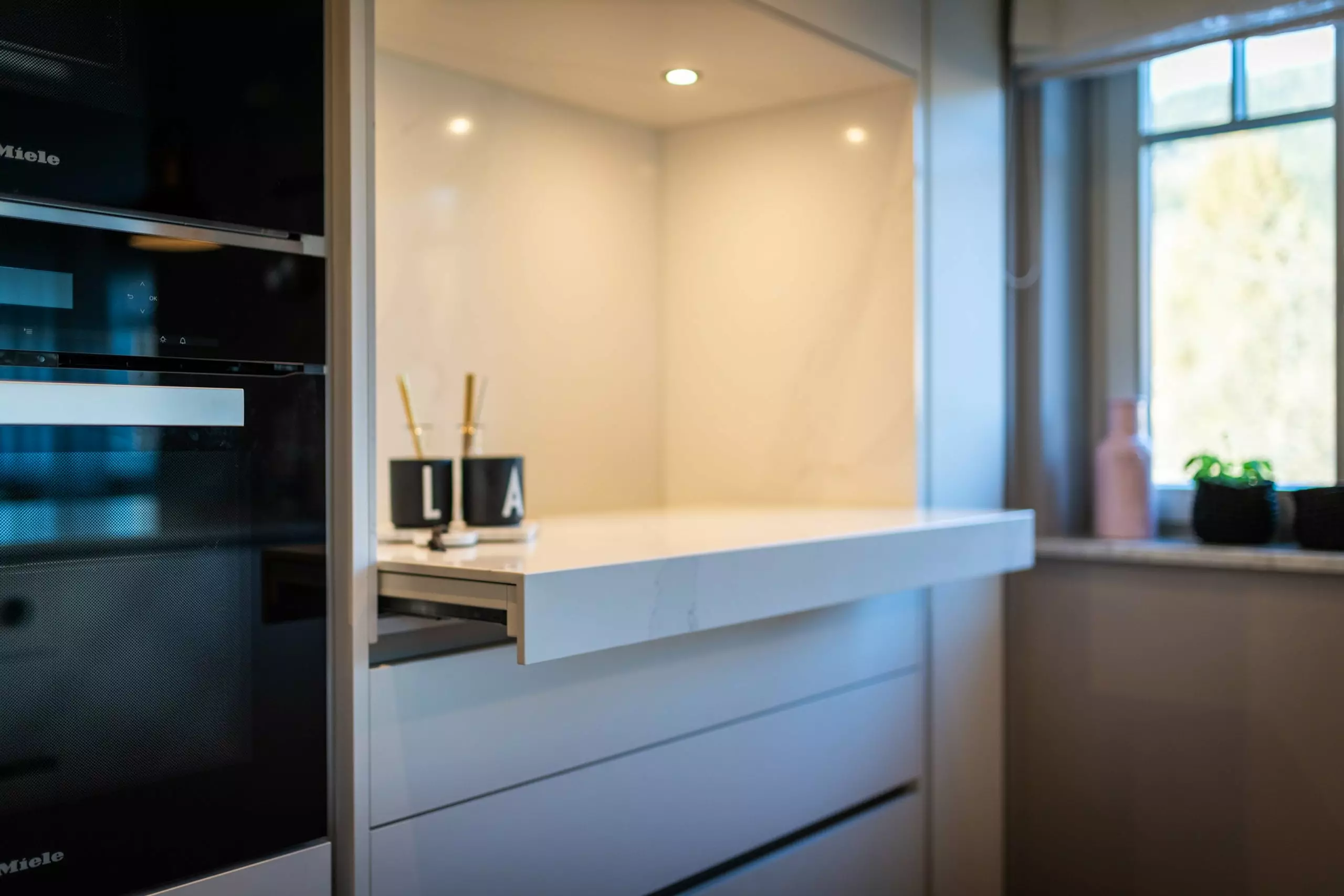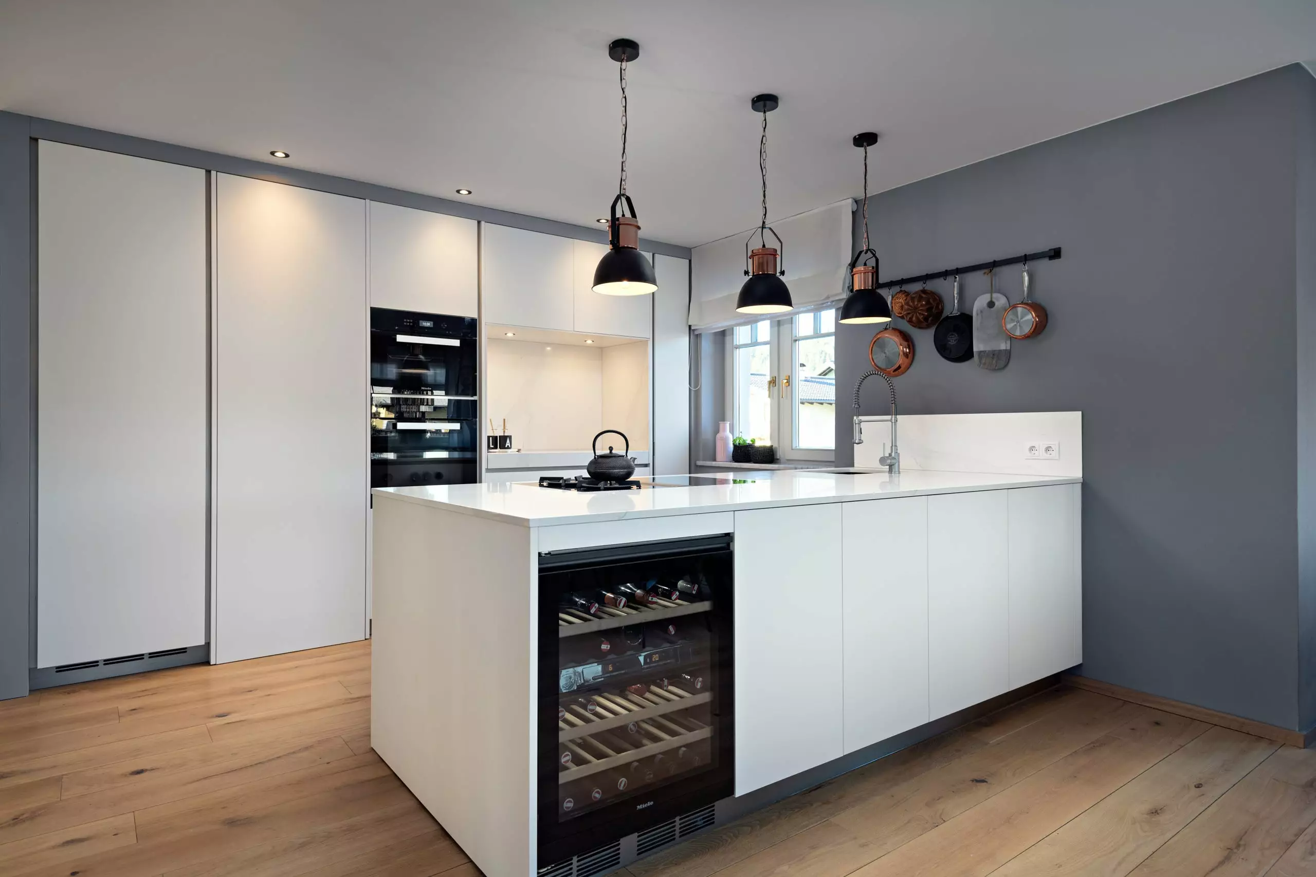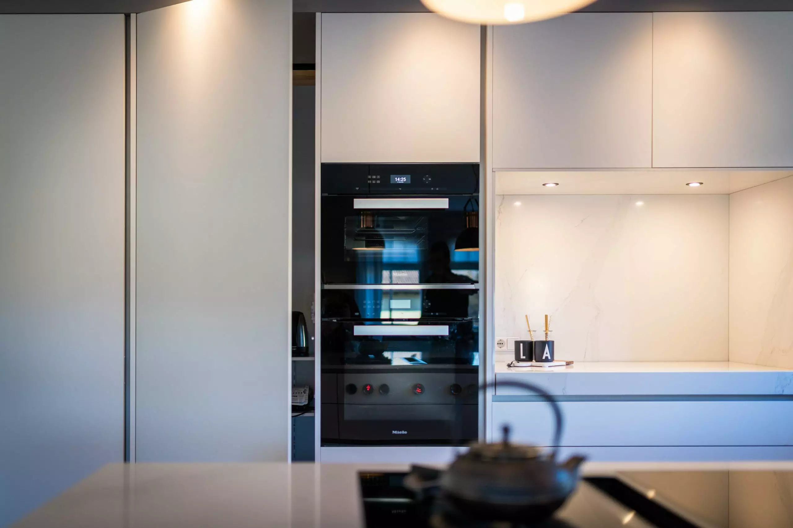 Die Front in Fenix Laminat superwhite in kombination mit der Arbeitsplatte aus Silestone Calacatta