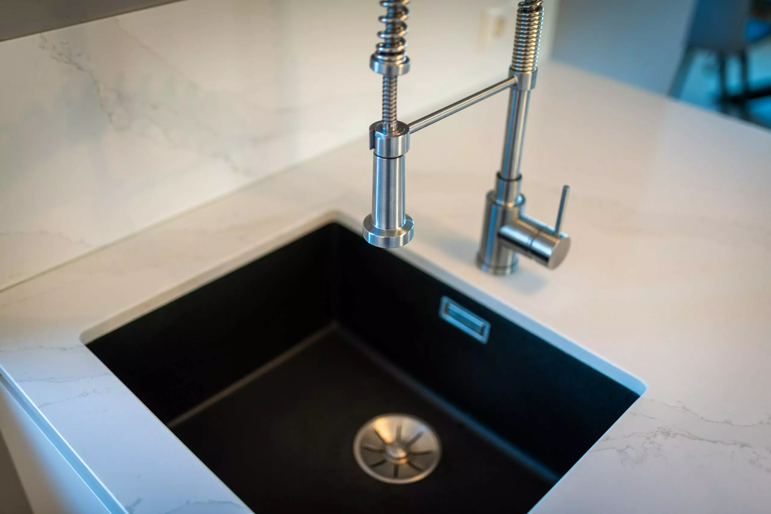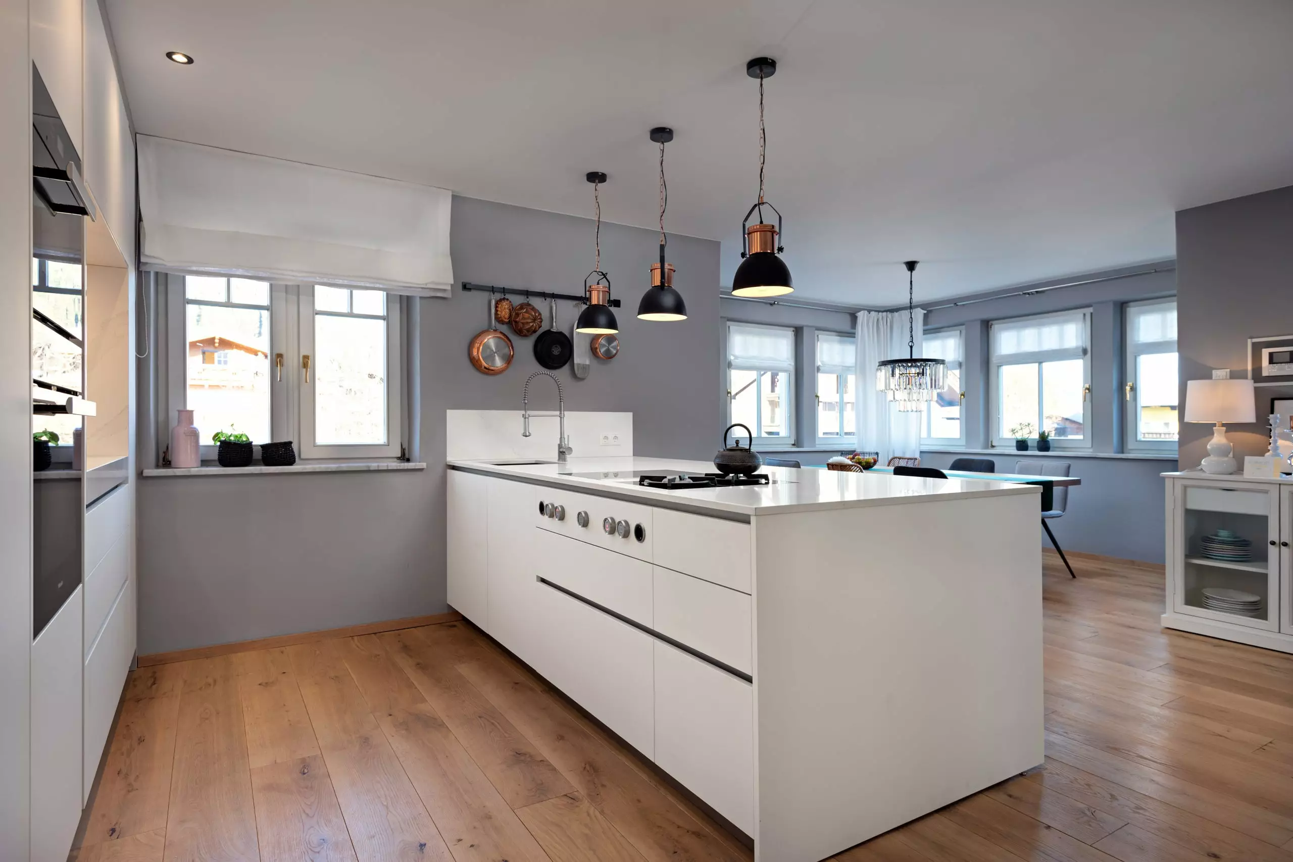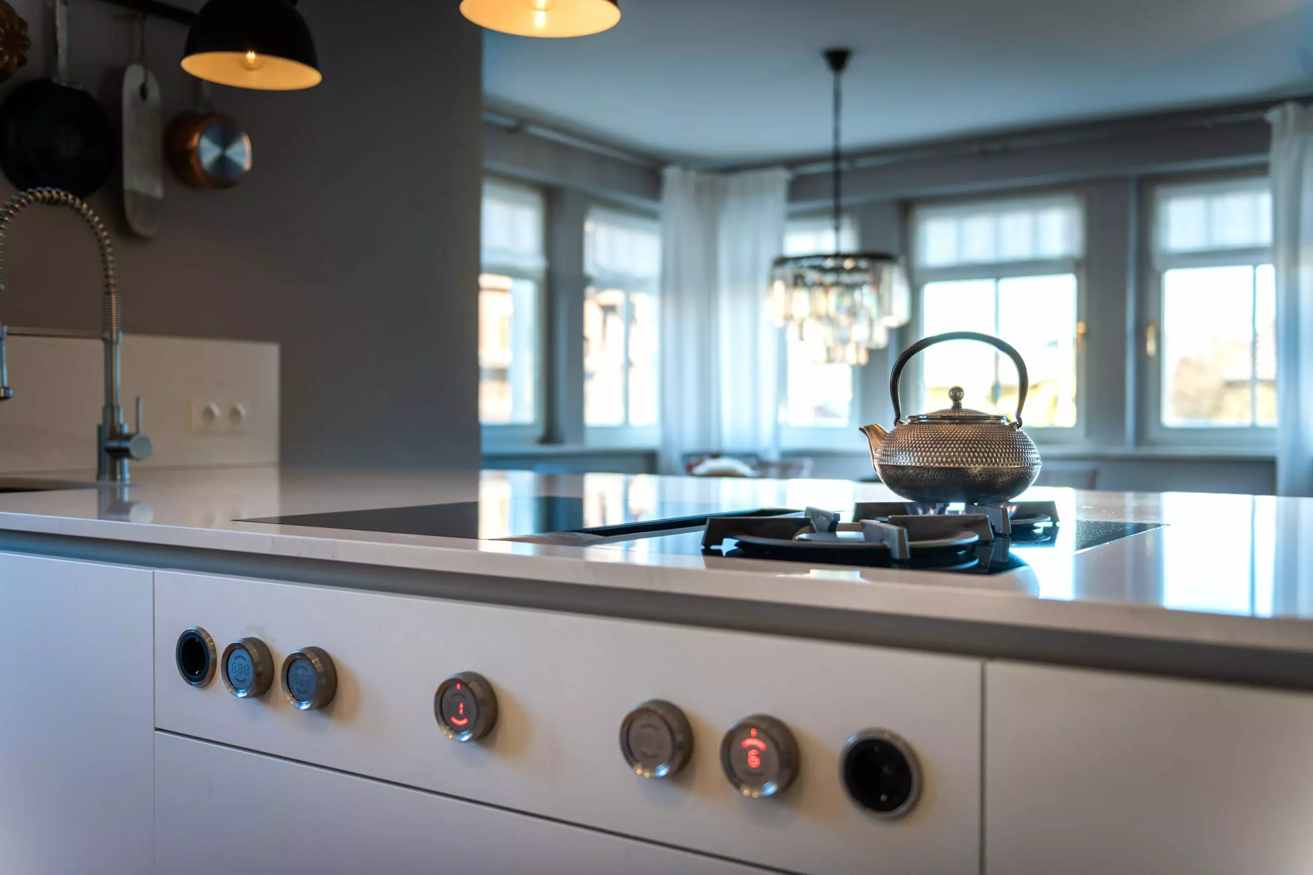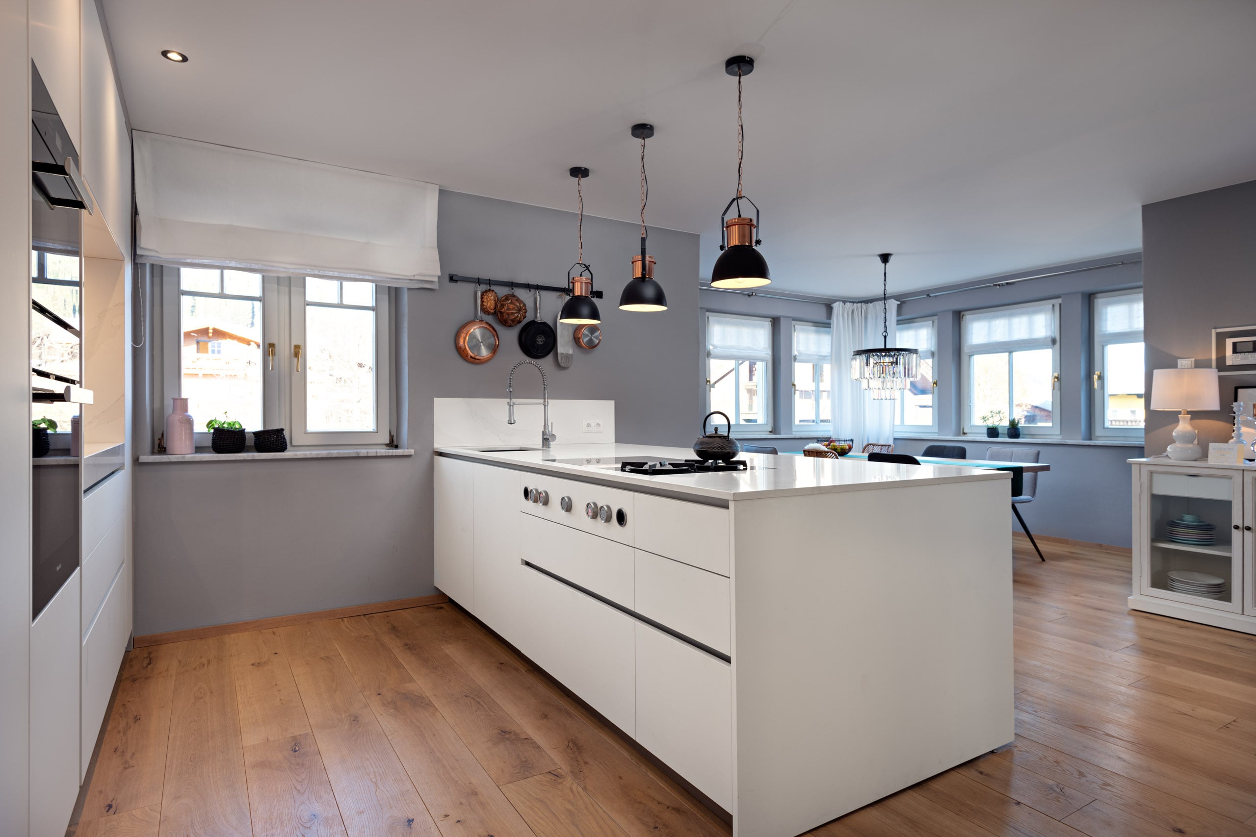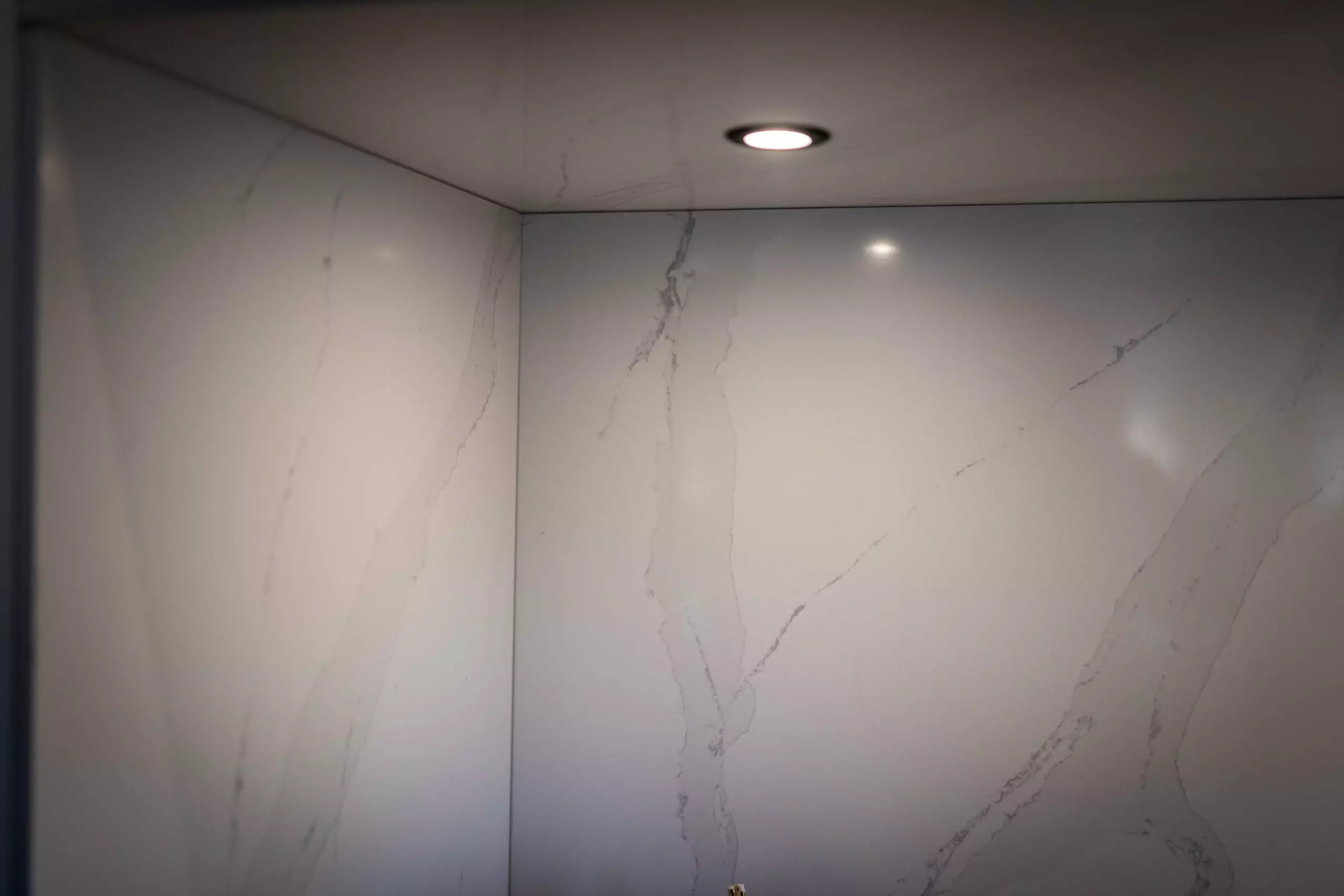 Die Front in Fenix Laminat superwhite in kombination mit der Arbeitsplatte aus Silestone Calacatta