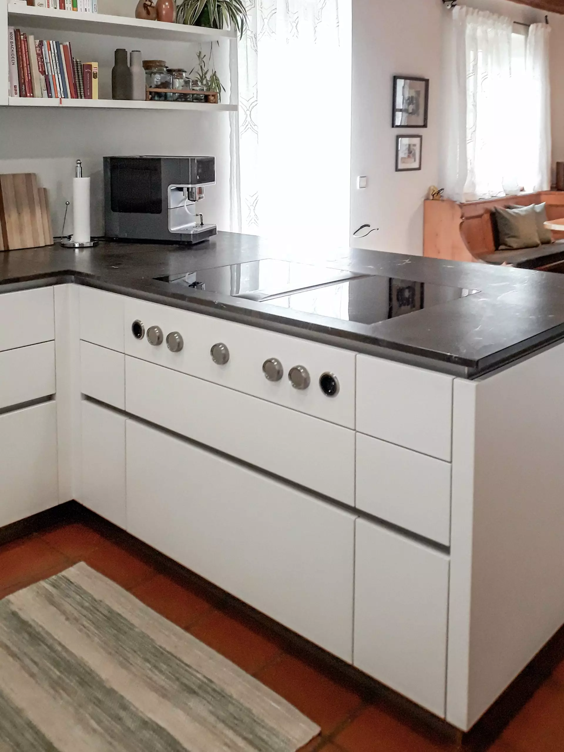 Die Front in Fenix Laminat black in kombination mit der Arbeitsplatte aus Silestone Steinarbeitsplatte